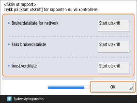Trykk på <Start utskrift> for rapporten som skal kontrolleres, og trykk på <OK> når utskriften er ferdig.