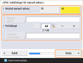 När du använder en manuell adress ställer du in <Använd manuell adress> på <På> och anger värden för <Manuell adress>, <Prefixlängd> och <Standardrouteradress>.