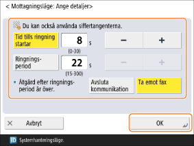 <Åtgärd efter ringningsperiod är över.>: Välj vilken åtgärd som ska utföras om handenheten inte tas upp medan maskinen ringer. Välj <Avsluta kommunikation> för att koppla från eller <Ta emot fax> för att ta emot faxet.