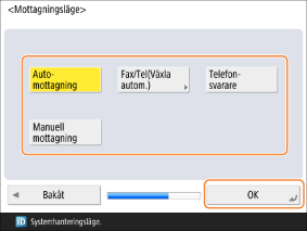 <Manuell mottagning>: Du måste använda maskinen manuellt när ett fax tas emot. Maskinen ringer när ett telefonsamtal tas emot.