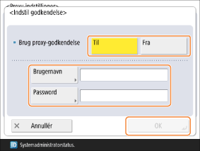 <Brug proxy-godkendelse>: For at anvende proxy-godkendelse skal du indstille dette til <Til> og indtaste værdierne i <Brugernavn> og <Password>.