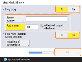 <Brug proxy>: For at forbinde eksternt via proxy-server skal du indstille dette til <Til> og indtaste værdierne i <Serveradresse> og <Portnummer>.