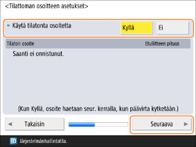 Kun tämän kohdan asetuksena on <Kyllä>, tilallinen osoite noudetaan automaattisesti seuraavan kerran, kun virta kytketään päälle.