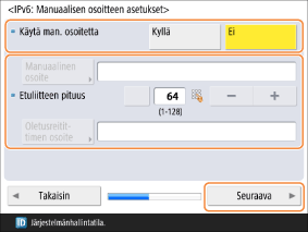 Jos manuaalista osoitetta käytetään, valitse kohdan <Käytä man. osoitetta> asetukseksi <Kyllä> ja syötä arvot kohtiin <Manuaalinen osoite>, <Etuliitteen pituus> ja <Oletusreitittimen osoite>.