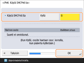 Konfiguroi asetus <Käytä DHCPv6:tta> ja paina <OK>:ta.