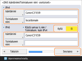 <Käytä samaa Is.nim./Toimialuen. kuin IPv4>: aseta tähän kohtaan <Kyllä>, jos haluat käyttää samoja asetuksia kuin protokollissa IPv4–IPv6.