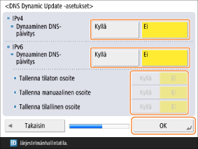 <Dynaaminen DNSpäivitys>: aseta tähän kohtaan <Kyllä>, jos haluat suorittaa automaattisen päivityksen silloin, kun esim. isäntänimen ja IP-osoitteen välinen yhteys muuttuu DHCP-ympäristössä.