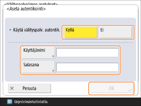 <Käytä välityspalv. autentik.>: jos haluat käyttää välityspalvelimen todennusta, aseta tähän <Kyllä> ja syötä arvot kohtiin <Käyttäjänimi> ja <Salasana>.