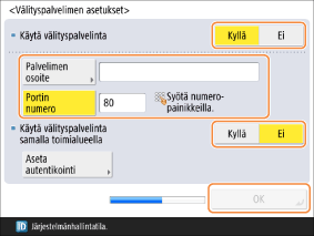 <Käytä välityspalvelinta>: jos haluat muodostaa yhteyden ulkoisesti välityspalvelimen kautta, valitse tämän asetukseksi <Kyllä> ja syötä arvot kohtiin <Palvelimen osoite> ja <Portin numero>.