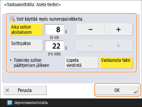 <Toiminto soiton päättymisen jälkeen>: Valitse toiminto, jonka laite suorittaa, ellei luuria nosteta laitteen soidessa. Valitse <Lopeta viestintä> yhteyden katkaisemiseksi tai <Vastaanota faksi> faksin vastaanottamiseksi.