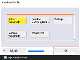 <Faksi/Puh (Autom. kytkin)>: laite vastaanottaa fakseja automaattisesti ja soittaa soittoäänen, kun puhelu vastaanotetaan.