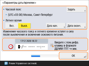 Настройте <Часовой пояс> и <Летнее время> и введите дату и время с помощью цифровых клавиш.