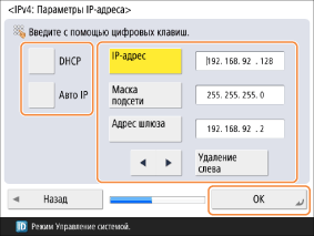 Чтобы ввести IP-адрес вручную, убедитесь, что не выбраны <DHCP> и <Авто IP>, и введите значения для <IP-адрес>, <Маска подсети> и <Адрес шлюза>.