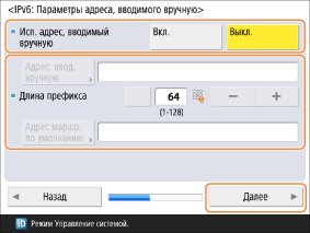 При вводе адреса вручную установите <Исп. адрес, вводимый вручную> на <Вкл.> и введите значения для <Адрес, ввод. вручную>, <Длина префикса> и <Адрес маршр. по умолчанию>.