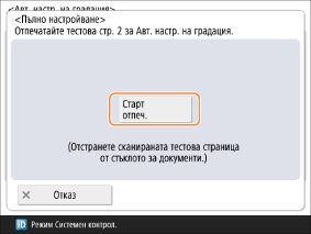 Натиснете <Старт отпеч.>, за да отпечатате тестова страница 2. Свалете тестовата страница 1 от стъклото на скенера, тъй като не се използва в следващите стъпки.