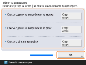 Натиснете <Старт отпеч.> за отчета, който искате да проверите, и натиснете <OK>, когато отпечатването приключи.