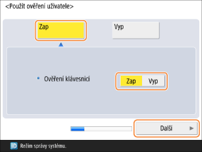 Chcete-li použít ověření uživatele, ujistěte se, že položky <Použít ověření uživatele> a <Ověření klávesnicí> jsou nastaveny na <Zap> a stiskněte <Další>.