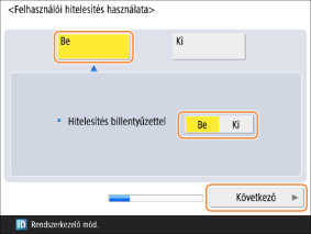A felhasználói hitelesítés használatához ellenőrizze, hogy <Be> állásba állította-e a <Felhasználói hitelesítés használata> és <Hitelesítés billentyűzettel> elemeket, majd nyomja meg a <Következő> lehetőséget.