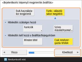 <Funkc. választásakor megjelnik>: Válassza ki ezt a bejelentkezési képernyő megjelenítéséhez, ha egy felhasználó használ egy funkciót, például a másolás funkciót. Kiválaszthatja, hogy minden egyes funkcióhoz kér-e hitelesítést.