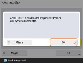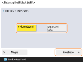 Ha a vezeték nélküli LAN útválasztó beállítása megosztott kulcs hitelesítés, nem csatlakozhat a <Nyílt rendszerű> lehetőséget választva. Amennyiben a <Nyílt rendszerű> lehetőséget választotta, a beállítás automatikusan <Megosztott kulcs>-ra módosul, és az újracsatlakozás végrehajtásra kerül.