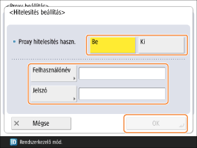 <Proxy hitelesítés haszn.>: A proxy hitelesítés használatához állítsa ezt <Be> állásba, és adja meg a <Felhasználónév> és <Jelszó> elemek értékeit.