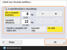 <Teendő a csengetési idő lejárta után>: Válassza ki milyen műveletet végezzen a készülék, ha nem veszi fel a kagylót a készülék csörgése közben. Válassza a <Kapcsolat vége> lehetőséget a bontáshoz vagy a <Fax vétel> lehetőséget a fax fogadásához.