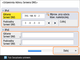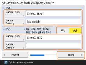 <Uż. Jedn. Naz. Hosta/Naz. Dom. jak dla IPv4>: ustaw tę opcję na <Włącz>, aby zastosować takie same ustawienia w IPv4 i IPv6.