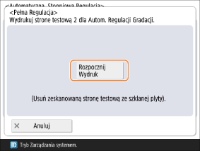 Naciśnij <Rozpocznij Wydruk>, aby wydrukować wydruk testowy nr 2. Zdejmij wydruk testowy nr 1 ze szklanej płyty, ponieważ nie będzie używany w kolejnych krokach.