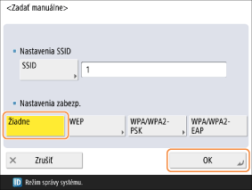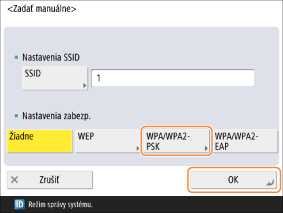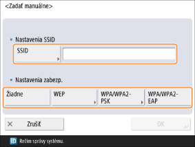 Zadajte SSID smerovača bezdrôtovej siete LAN, ku ktorému sa má vykonať pripojenie, a zvoľte nastavenia zabezpečenia.