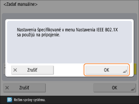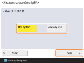 Keď sa na smerovači bezdrôtovej siete LAN nastavilo overenie pomocou zdieľaného kľúča, nebude možné sa pripojiť pomocou zvolenej možnosti <Otv. systém>. Ak ste zvolili <Otv. systém>, príslušné nastavenie sa automaticky zmení na <Zdieľaný kľúč> a vykoná sa opätovné pripojenie.