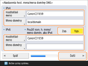 <Použiť rovn. h. meno/meno domén. ako IPv4>: Túto položku nastavte na <Zap.>, aby sa použili rovnaké nastavenia ako IPv4 až IPv6.