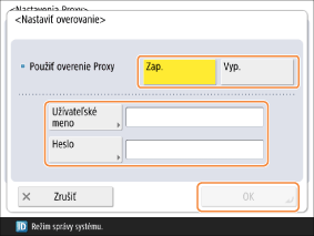 <Použiť overenie Proxy>: Ak chcete používať overenie prostredníctvom servera proxy, nastavte túto položku na <Zap.> a zadajte hodnoty v <Užívateľské meno> a <Heslo>.