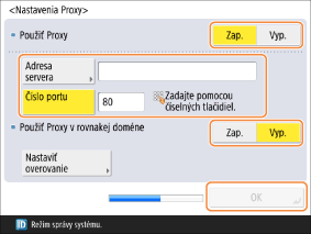 <Použiť Proxy>: Ak chcete vykonať externé pripojenie prostredníctvom servera proxy, nastavte túto položku na <Zap.> a zadajte hodnoty v <Adresa servera> a <Číslo portu>.