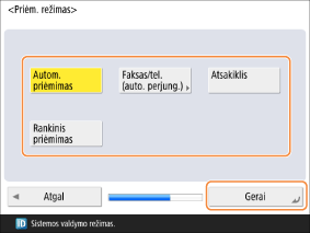 <Rankinis priėmimas>: turėsite valdyti aparatą rankiniu būdu, kai priimama faksograma. Aparatas suskamba esant įeinančiam telefono skambučiui.