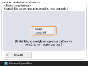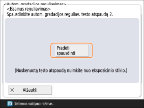 Spauskite <Pradėti spausdinti>, kad atspausdintumėte Bandomąjį puslapį 2. Nuimkite Bandomąjį puslapį 1 nuo stiklo, kadangi jis nenaudojamas tolesniems žingsniams atlikti.