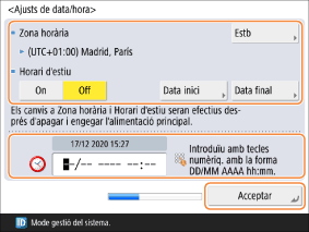 Configureu <Zona horària> i <Horari d'estiu> i introduïu la data i l’hora mitjançant les tecles numèriques.