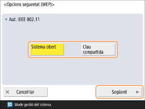 Quan l’autenticació de clau compartida s’estableix a l’encaminador de xarxa sense fil, no us podreu connectar amb <Sistema obert> seleccionat. Si seleccioneu <Sistema obert>, les opcions canvien automàticament a <Clau compartida> i es duu a terme la reconnexió.