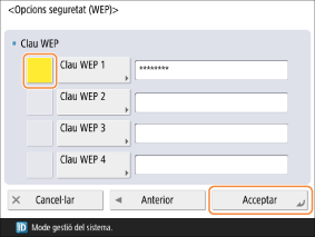 Seleccioneu <Clau WEP 1> o <Clau WEP 4> i introduïu la clau WEP.