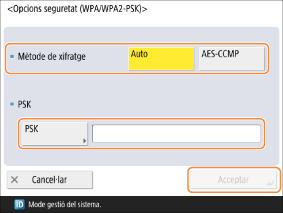 Seleccioneu <Mètode de xifratge>, introduïu la clau a <PSK> i premeu <Acceptar>.