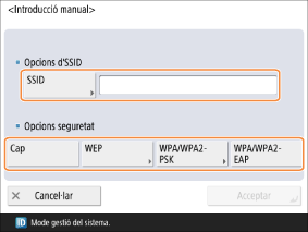 Introduïu l’SSID de l’encaminador de xarxa sense fil al qual us connectareu i seleccioneu les opcions de seguretat.