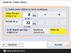 <Acció després que hagi acabat el so>: Seleccioneu la resposta de l’equip si el telèfon no es despenja mentre l’equip emet el to. Seleccioneu <Finalitza la comunicació> per penjar o <Rebre fax> per rebre el fax.
