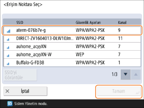 Bağlanılacak kablosuz LAN yönlendiricinin SSID’sini seçin ve <Tamam> düğmesine basın.