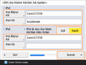 <IPv4 ile Aynı Ana Makn Adı/Alan Adını Kullan>: IPv4 ile aynı ayarları IPv6’ya uygulamak için bunu <Açık> olarak ayarlayın.