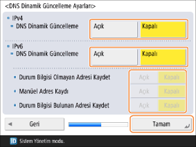 <DNS Dinamik Güncelleme>: Bir DHCP ortamından vb. ana bilgisayar adı ve IP adresi arasındaki ilişki değiştiğinde otomatik güncelleme yapmak için bunu <Açık> olarak ayarlayın.