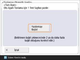 Test Sayfası 2’yi yazdırmak için <Yazdırmayı Başlat> düğmesine basın. Sonraki adımlarda kullanılmayacağı için, baskı levhası camından Test Sayfası 1’i çıkarın.