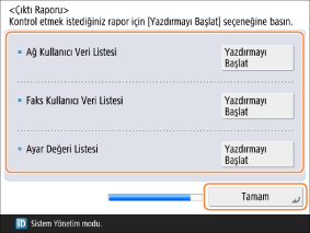 Kontrol edilecek rapor için <Yazdırmayı Başlat> düğmesine basın ve yazdırma tamamlandığında <Tamam> düğmesine basın.