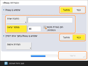 <שימוש ב-Proxy>: כדי להתחבר באופן חיצוני באמצעות שרת, קבע שדה זה בתור <מופעל> והזן ערכים ב-<כתובת שרת> וב-<מספר יציאה>.