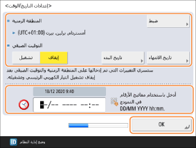 قم بتهيئة <المنطقة الزمنية> و<التوقيت الصيفي> وأدخل التاريخ والوقت باستخدام المفاتيح الرقمية.