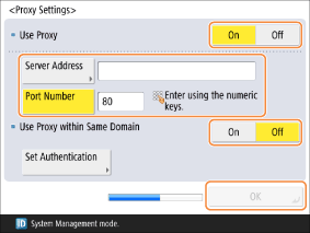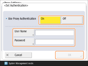 <Use Proxy Authentication>: برای استفاده از تأیید اعتبار پراکسی، این گزینه را روی <On> تنظیم کنید و مقادیر را در <User Name> و <Password> وارد کنید.