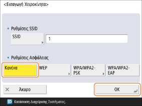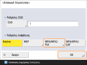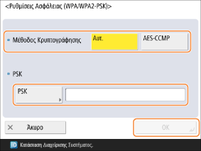 <Αυτ.>: Η συσκευή ρυθμίζει αυτόματα το AES-CCMP ή το TKIP σύμφωνα με τις ρυθμίσεις του δρομολογητή ασύρματου LAN για σύνδεση.
